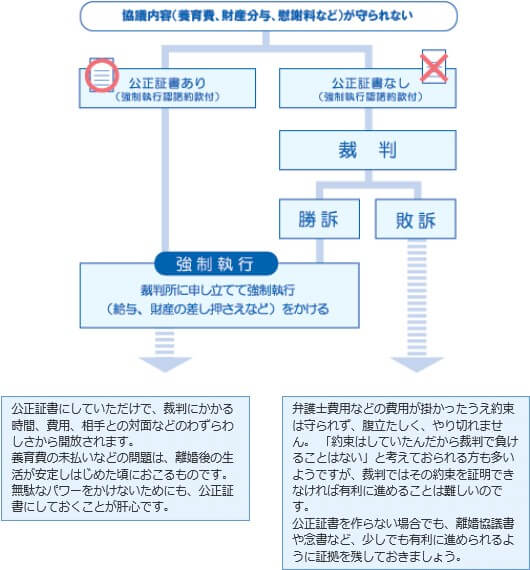 こうした事をさけるために作っておいていただきたいのが“公正証書”なのです。公正証書とは、離婚の協議内容を、法務大臣から任命された公証人が証明し、離婚時の協議内容が実現されなかった際に、裁判をすることなく相手の財産に強制執行をかけることができるものです。